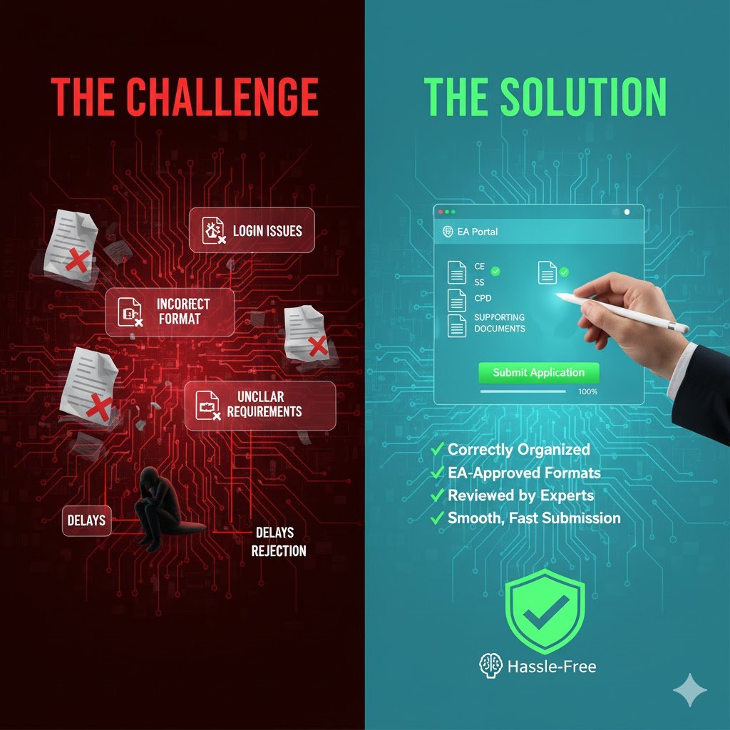 Many engineers struggle with the Engineers Australia (EA) portal due to unclear document requirements, login issues, incorrect file formats, and confusion about where to upload CE, SS, and CPD. Small mistakes—like incomplete CDR files, wrong project documents, or outdated CPD lists—often lead to delays, repeated document requests, or even rejection. These errors waste time, money, and slow down the entire MSA process.
